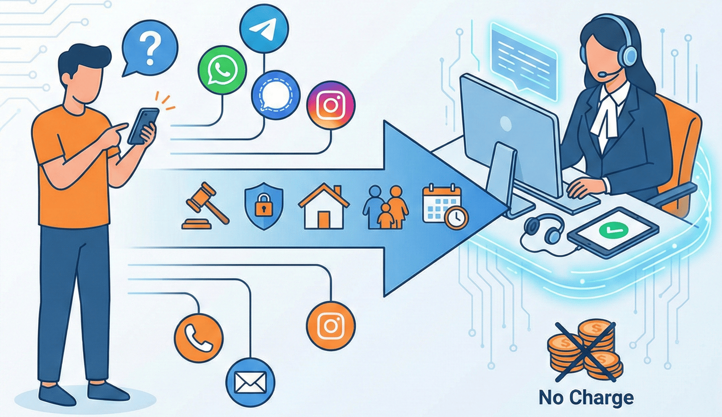 What to Do: Send a brief message via WhatsApp / Arattai / Telegram / Signal / Instagram, email, or phone explaining your legal issue in one go.